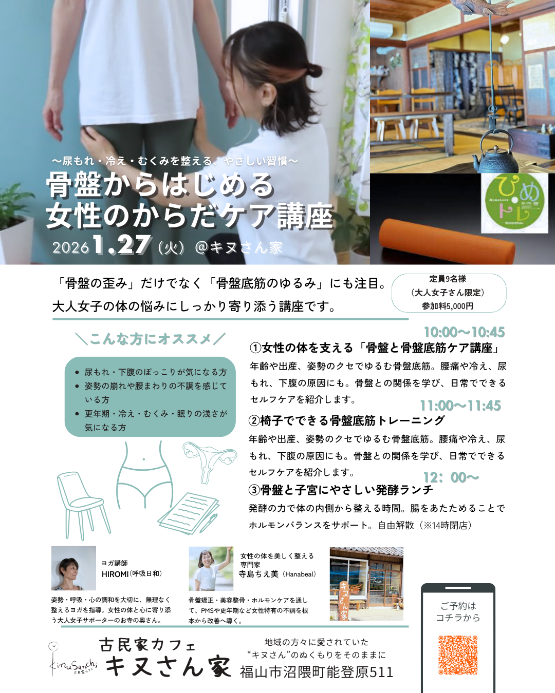 1月27日(火)は、 骨盤の歪みとゆるみに着目した特別講座を開催します。 前半は、Hanabeal寺島ちえ美さんによる 「骨盤と骨盤底筋ケア講座」。 女性の体の仕組みをわかりやすく学びながら、 日常でできるセルフケアを実践します。 後半は、HIROMIによる椅子トレーニング。 座ったままで無理なくできる骨盤底筋トレで、 その場で体の変化を感じられる人気の内容です。 最後は「骨盤と子宮にやさしい発酵ランチ」で内側から整う時間。 冷えや不調を手放し、自分の体と向き合う1日をどうぞ。