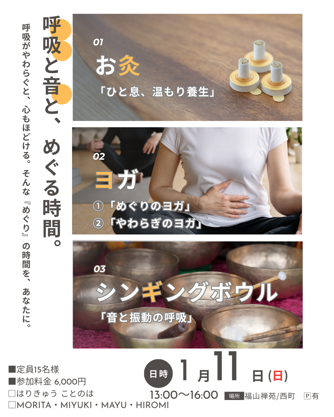 お灸・ヨガ・音の振動という三方向からアプローチすることで、忙しさで固まった体と心をゆるめていきます。